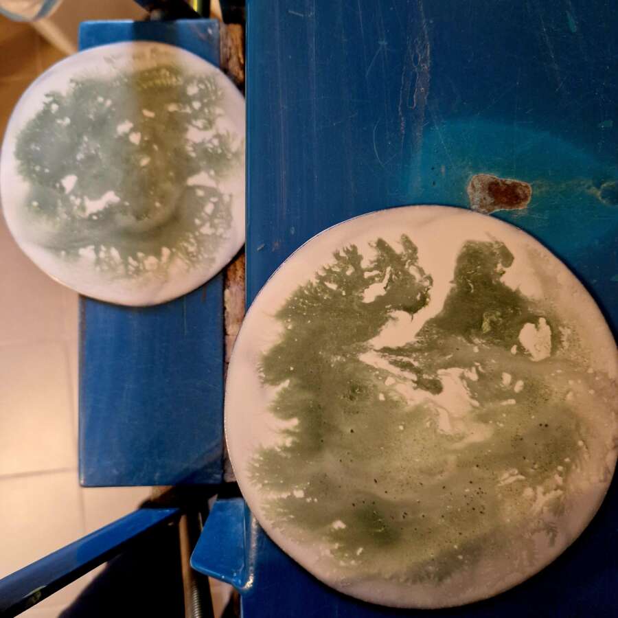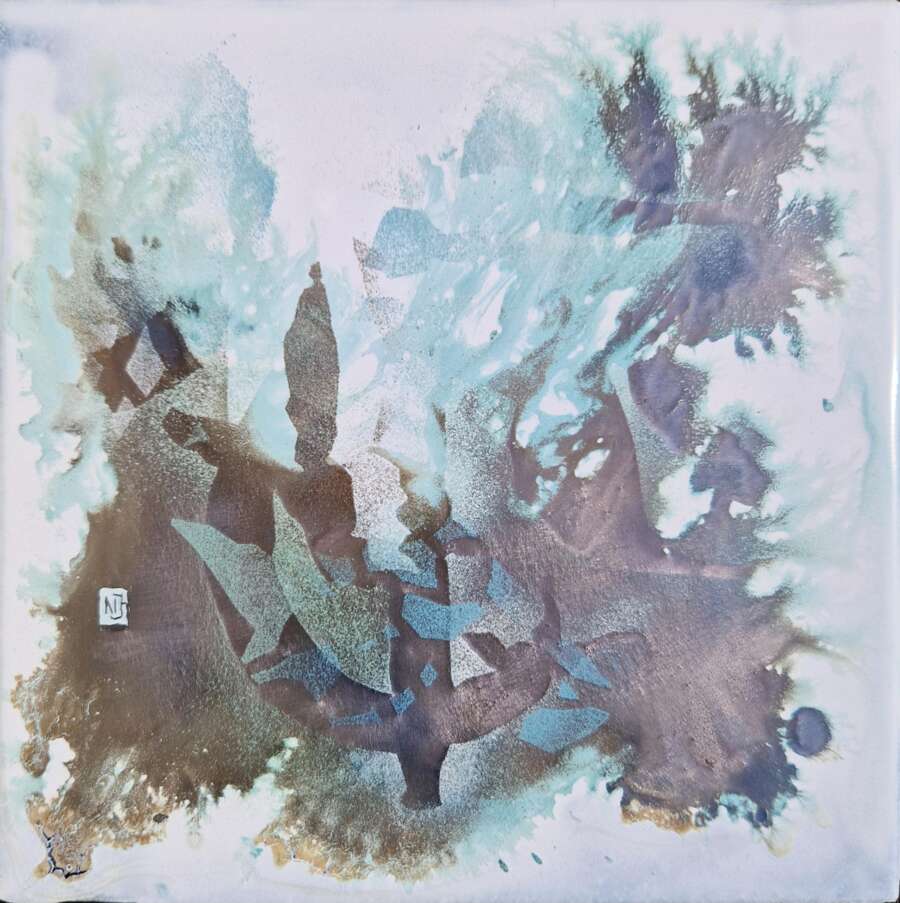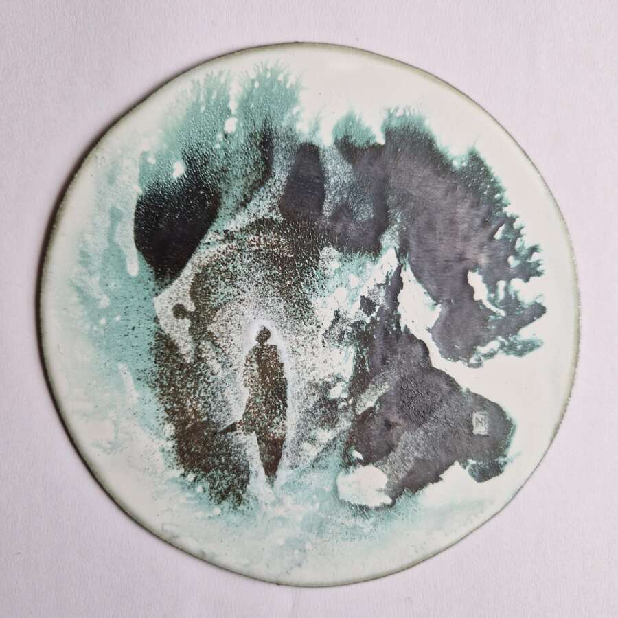 2025 második felében olyan zománcokkal dolgoztam, melyek titánfehér és krém színmezőkbe fogadták be fémes zománcok kipárolgását, formaalkotását; és a benne rejlő organikus, természetközeli témák lehetőségeit.